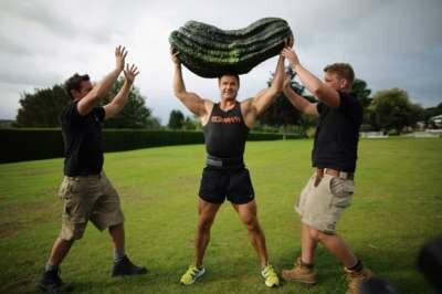 Штангист Джонатан Уокер поднимает кабачок весом 119 фунтов 12 унций, выигравший в этой категории на осеннем фестивале урожая 14 сентября 2012 года в Харрогит, Англия. Гигантский кабачок был выращен Петром Глейзбруком из Ньюарка, который выиграл все шесть классов в соревновании гигантских растений во время выставки. (Christopher Furlong / Getty Images)