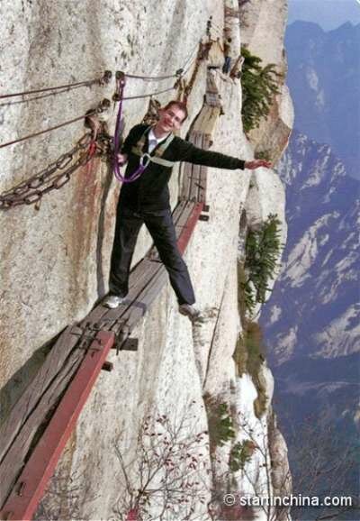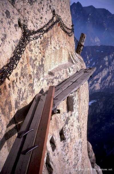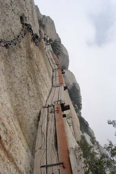 Словно для последних создан этот «аттракцион». Huashan Mountain или китайская гора Хуашань — это место, куда стремятся сильные духом, желающие преодолеть свой страх и испытать острые ощущения. Хотя подъём на неё фактически не связан с серьёзным риском, всё же для преодоления пути потребуется немало смелости и — физической подготовки.