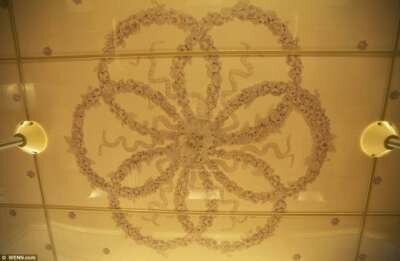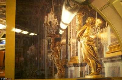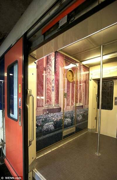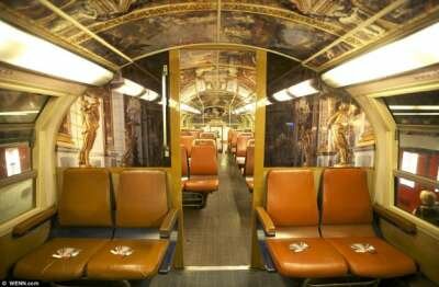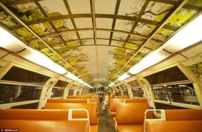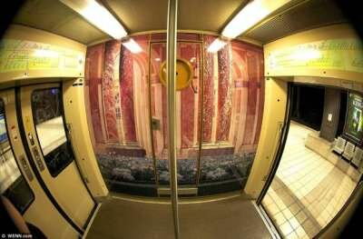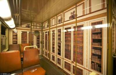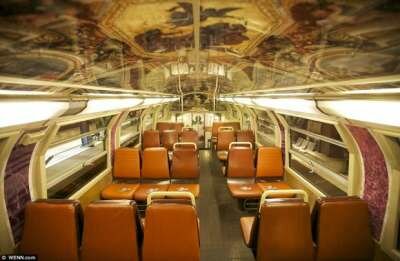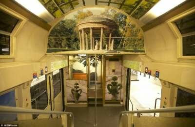 Надо сказать, что атмосфера дворца в поезде ощущается. В окнах отражаются изображённые на пластиковой плёнке золотые статуи и полки книг, наверху — расписные потолки, двери выполнены в ярких тонах. Снаружи вагон обычный, но плакаты на окнах и дверях сообщают всем, что их ждёт незабываемая поездка.